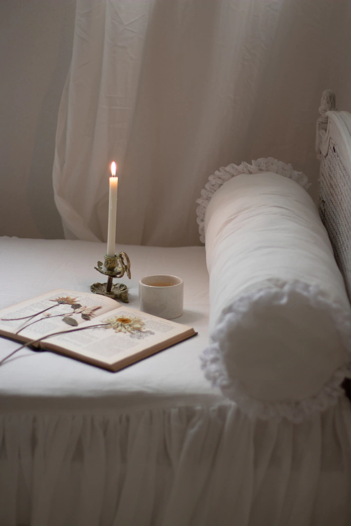 Confeccionado en tusor 100% algodón y tul angosto bordado.