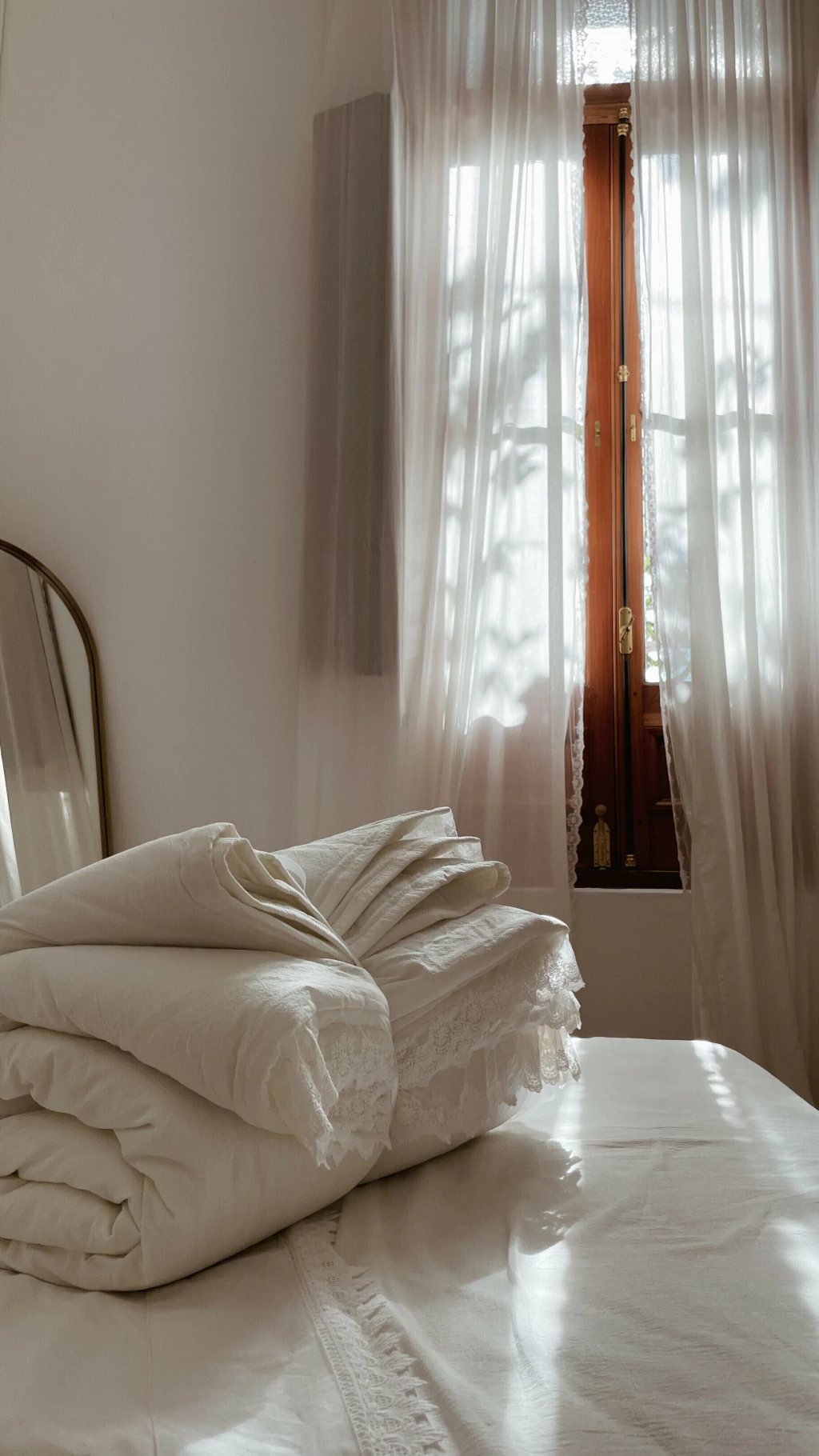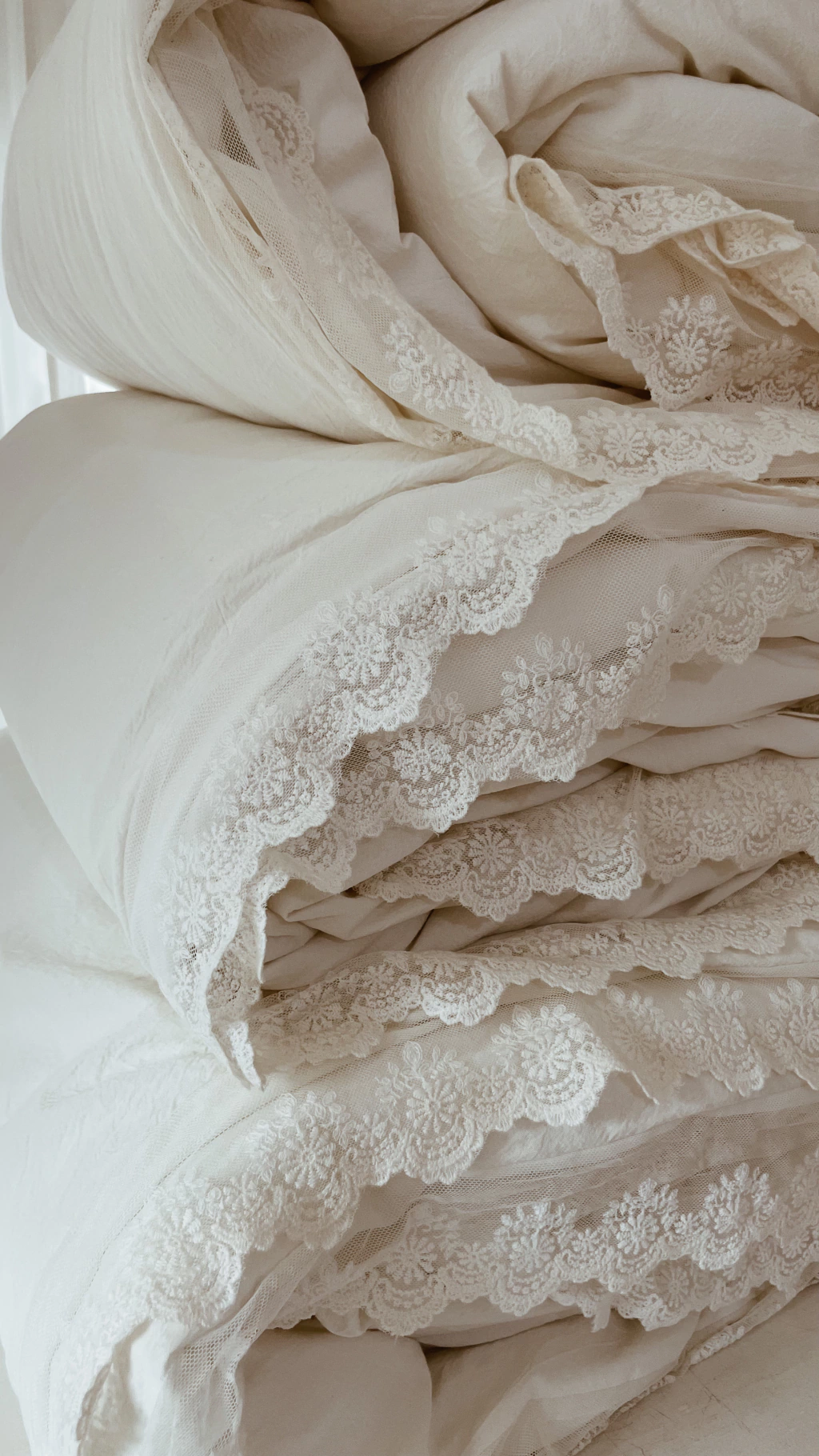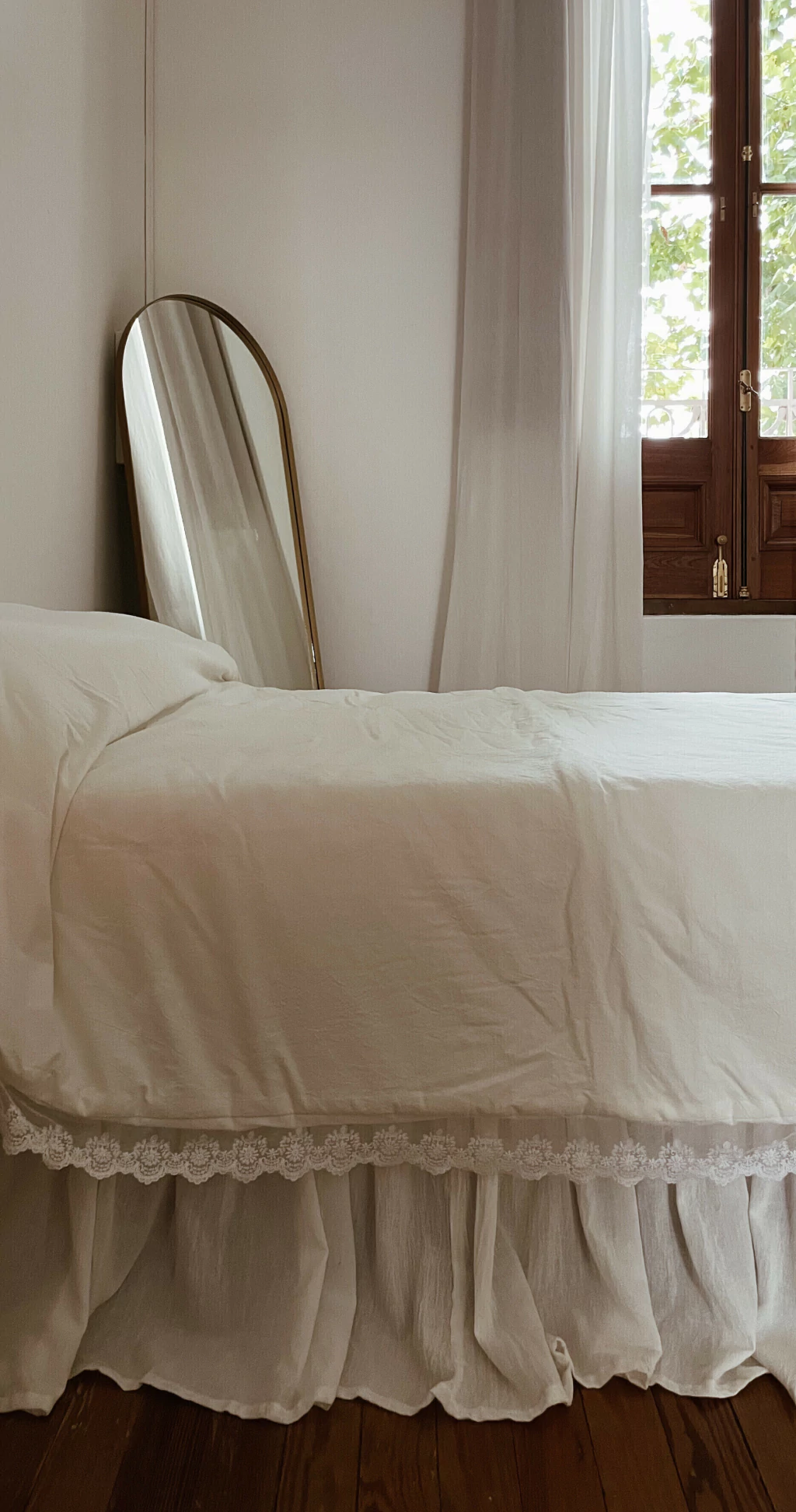 Confeccionado en tusor de algodón con tul bordado en 3 lados (no lleva tul en la cabecera) y relleno de guata siliconada cosida.